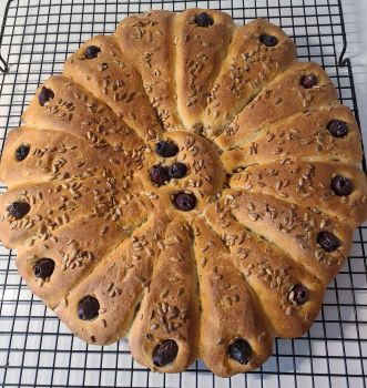 1 pkg active dry yeast 1/4 cup warm water (105F to 115F) Pinch of sugar or drop of honey 1¼ cups water at room temperature 1 tblsp honey 2 tblsps extra-virgin olive oil, plus more for brushing 3¼ cups unbleached all-purpose flour 1½ tsps salt 1 tblsp aniseed or minced fresh rosemary (love the rosemary) 1/4 cup sunflower seeds 2 dozen oil-cured black olives, pitted, or 1/2 cup seedless red grapes In a large bowl, sprinkle the yeast over the warm water. Add the sugar or honey, stir to dissolve, and let stand until foamy, about 10 minutes. Stir in the room-temperature water, the 1 tablespoon honey, and the 2 tablespoons olive oil. Using a wooden spoon or a heavy-duty mixer, add 1 cup of the flour and the salt and mix until smooth. Grind the aniseed in a mortar to release the flavors, if using. Beat the aniseed or rosemary into the mixture. Beat in the remaining 2¼ cups flour, 1/2 cup at a time (Oops. I dumped it in all at once. Turned out fine.), until the dough comes together in a loose ball. Using a heavy-duty mixer fitted with the dough hook, or by hand on a lightly floured board, knead the dough until smooth and elastic, 8 to 10 minutes. Put the dough in a lightly oiled bowl, turn to coat, and cover with plastic wrap or a damp tea towel. Let rise in a warm place until doubld, about 1½ hours. Lightly oil a 14-inch pizza pan. (I skipped this next part and just plopped dough onto pizza pan then stretched out to 14 inches.) Punch down the dough, turn out on a lightly floured board, and knead until smooth, 1 or 2 minutes. Roll the dough out into a 14-inch round and place on the pizza pan. With a glass turned upside down, cut out a 3-inch round, (but leave the dough in place). Then with a pastry scraper or knife, divide the outer circle of dough into fourths. Cut each piece into fourths again to make 16 slices. (No need to do this next sentence.) Twist each cut strip over and lay it flat. Brush the dough with olive oil and sprinkle with the sunflower seeds. Stud the end of each strip with an olive or a grape and place several in the center. Cover with a tea towel and let rise until doubled, about 45 minutes.